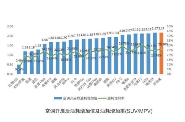 SUV开启空调后,MPV的平均油耗增加了2.17L,平均油耗增加了26.10%。