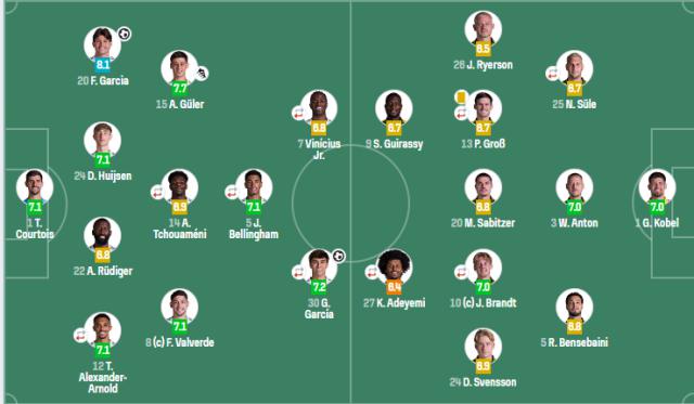 前峰:5- 贝林厄姆(67 ’ 9- 姆巴佩)、7- 维尼修斯(67 ’ 10- 莫德里奇)、30- 贡萨洛 · 加西亚(86 ’ 11- 罗德里戈)