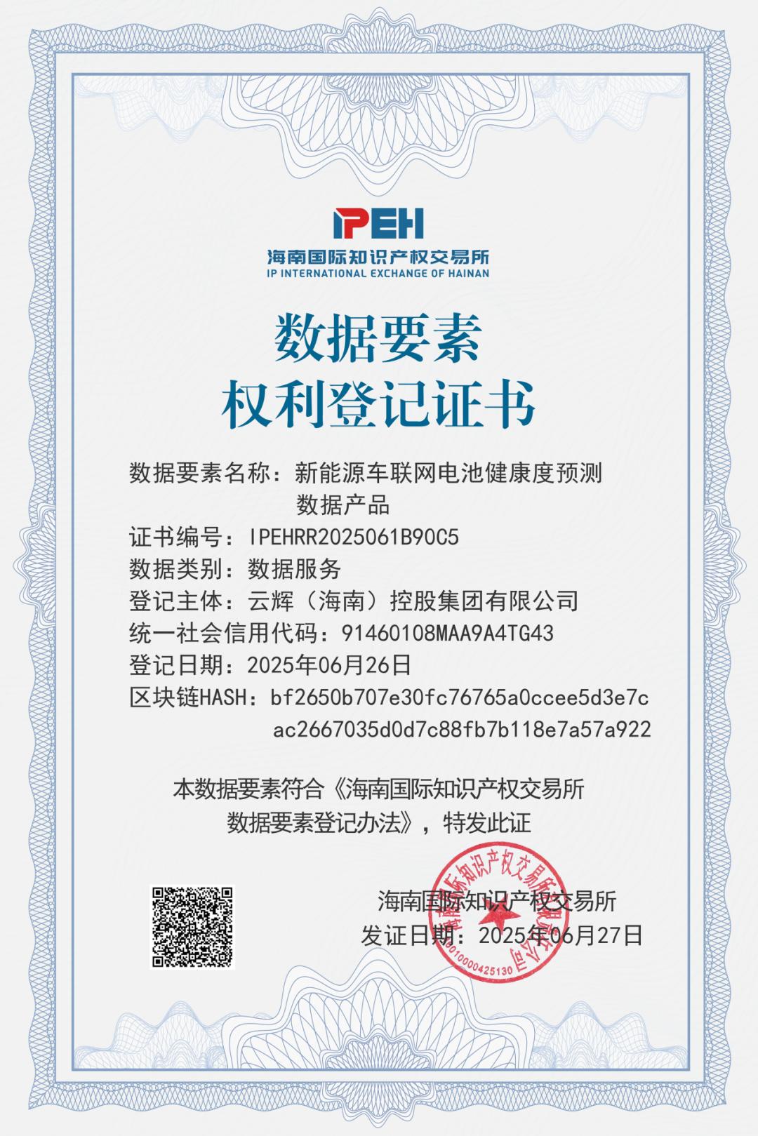 近日,云辉(海南)控股集团有限公司(以下简称云辉融电)核心数据商品“新能源汽车联网电池健康预测数据”在海南国际知识产权交易所(以下简称海知所)成功完成三亚首个数据要素权利登记。