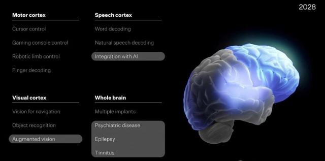 2028 2000年,每一条植入物通道超过 25000 文章,多部件协同接入,深度大脑区域随意阅读和写作,不仅可以治疗精神疾病和慢性疼痛,还可以使人机思维并轨,真正打开“全脑接口”时代。