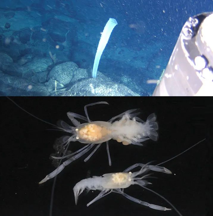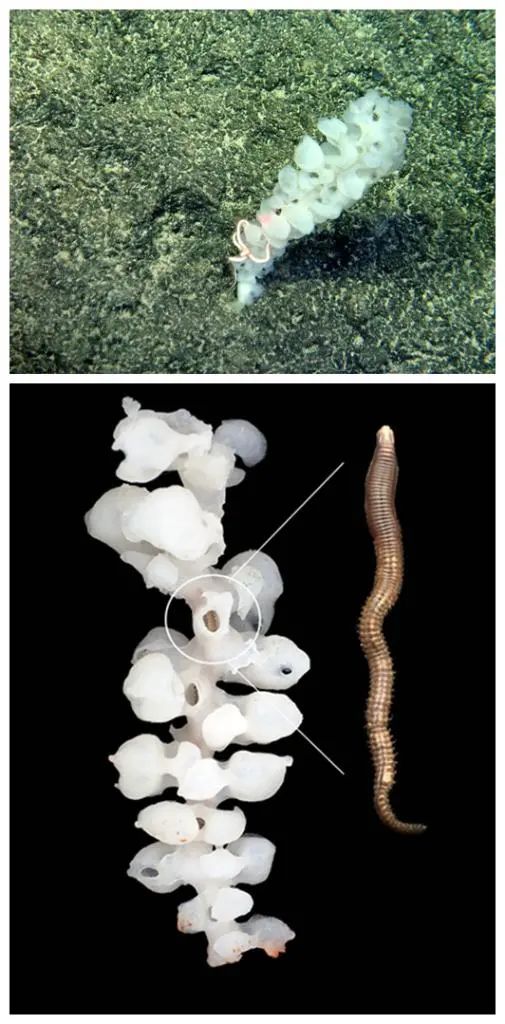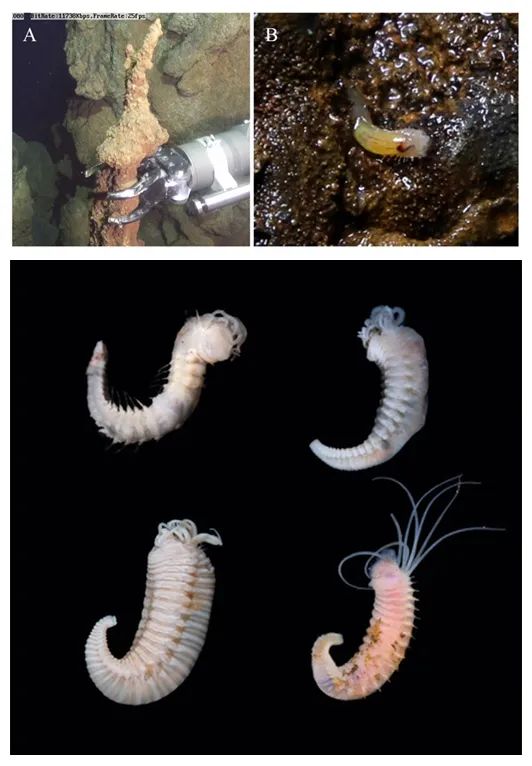 “生命的绿洲”是深海热液区,聚集了大量独特的海底生命。但是一墙之隔非活动热液区,则满眼沧桑,看上去毫无生气。真的没有生命吗?在死亡烟囱(喷发活动完全停止)表面的细小缝隙中,研究人员意外地发现,这里聚集了一种独特的管栖多毛,它们可能以死亡烟囱上残留的有机颗粒为食。虽然它的形态特征与最近的亲属非常相似,但是基因测序的结果表明,两者的祖先已经分化了相当长的历史。科研人员结合头部领器官的特点,将其命名为“领多栉虫”。在随后的研究中,两个帽贝新种被进一步发现在死亡烟筒上。