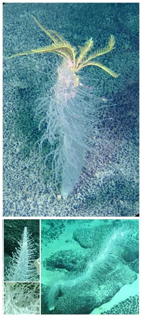 我国科学家在西太平洋海山发现了一种新的“偕老同穴海棉”。管形的“爱情公寓”外,伸出许多细长的“枝条”。这种“树枝”就像海底的停靠站,让海百合、蛇尾、虾等小生物依附于生命。看起来,整个海棉就像一个在海底掌管生命繁荣的女神。科学家们用希腊丰收女神的名字来命名这种新型海绵,也叫“女神海绵”。