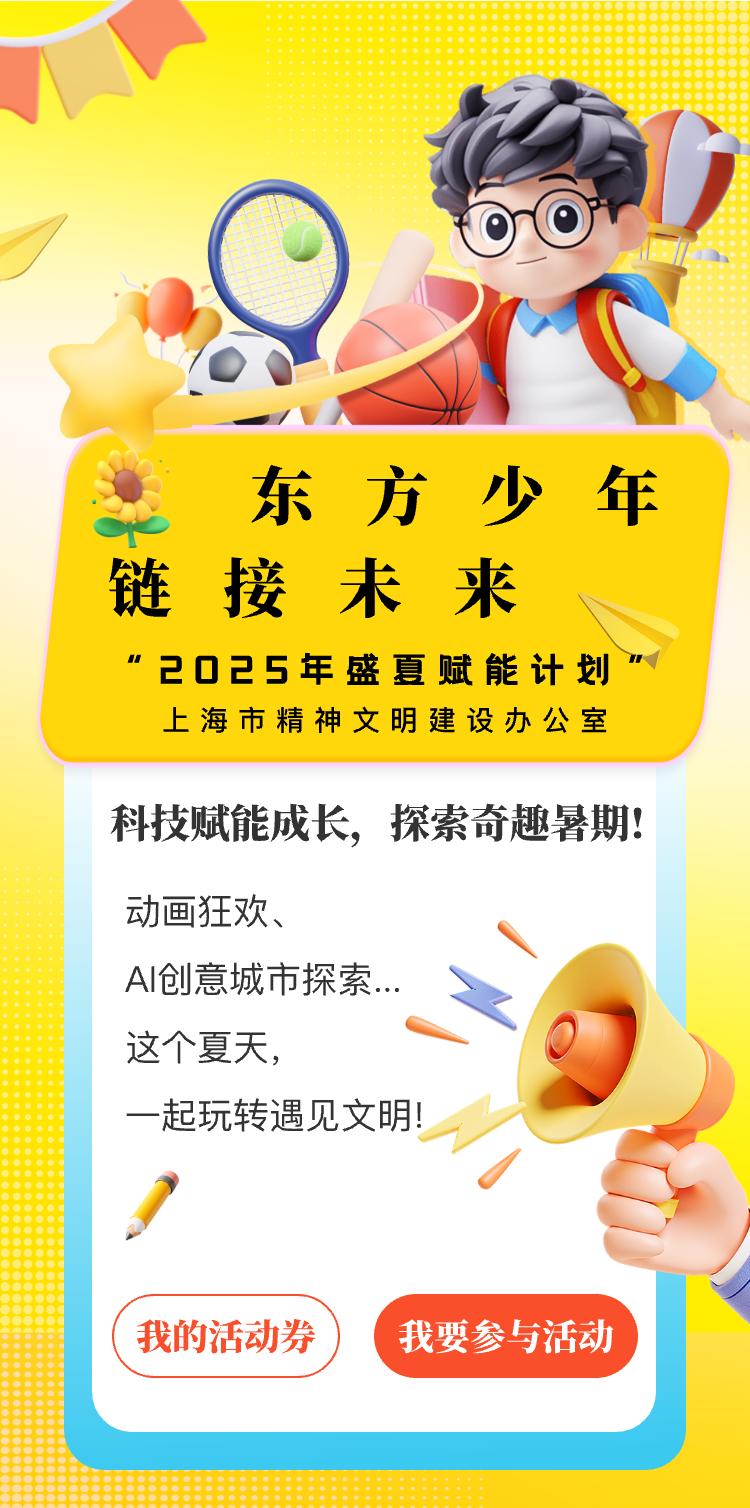 为了引导未成年人继承红色基因,坚定信念,培养创新意识,提高实践技能,过一个安全、健康、快乐、有益的暑假。据市精神文明办介绍,6-8月,“红星筑梦”、“智创未来”、“青春破浪”、“艺彩绽放”、“文明润心”五大主题将被广泛组织,2000多项优秀的未成年暑期活动将与上海电影股权、木偶剧团联动,为学生带来五折优惠,为全市青少年送上一份特别的暑假礼物。有关暑期活动专区已在“随申办”正式上线,多种奖励活动可一键预约,一起来了解一下参与方式吧。↓