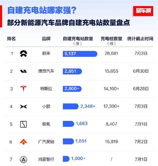 快科技 7 月 6 日前,易车榜发布了国内新能源汽车品牌自建充电站数量盘点。