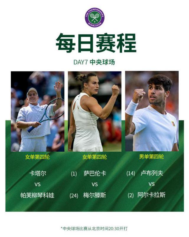 7 月 6 日,温网将进入第一 7 比赛日的比赛。本赛日男女单挑第一 4 轮比赛将上演,阿尔卡拉斯、萨巴伦卡等著名球员将冲击四分之一决赛。中国老将张帅一日双赛,在女双和混双赛场双双冲击四分之一决赛,其中一场中国德比将在混双赛场上上演。