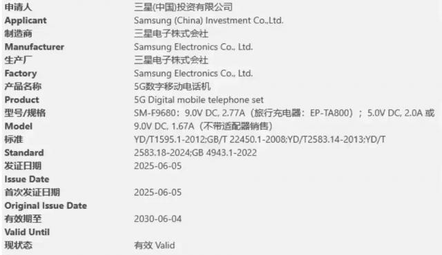 目前,Galaxy Z Fold Ultra 已通过国内 3C 认证,型号为" SM-F9680 "(后缀 0 代表国行版),无电源适配器销售,支持型号为 EP-TA800 旅行充电器,最大支持 25W 充电。
