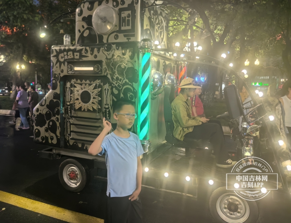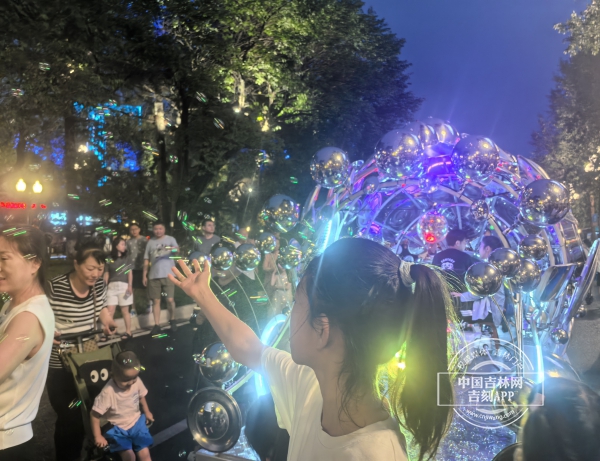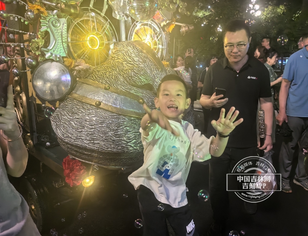 不远处,赛博巡游队正在街上行进,孩子们追逐着发光的泡泡,笑声传遍了整条街道。