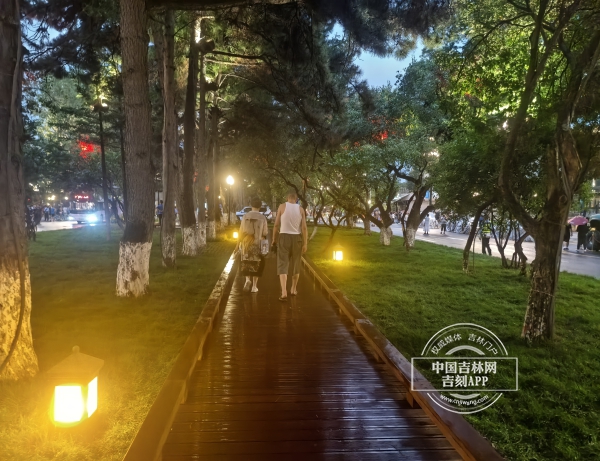 中央绿化带的“鸟巢灯”悄然“苏醒”,化为点点星光,与树影同舞,为游客创造了一条梦幻般的星光步道。