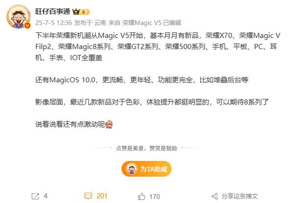 快科技 7 月 6 日前,数码博主“旺仔百事通”发文称,下半年荣耀新机潮从下半年开始 Magic V5 一开始,基本月份有新产品。