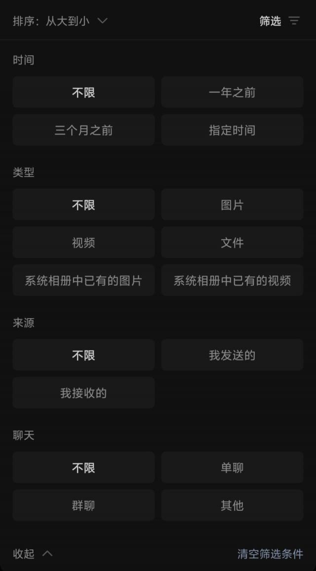 在新版本的管理中,可以准确选择不同时期、不同类型的图片、视频、文档,以及我发送或接收的不同来源,甚至单聊、群聊等。