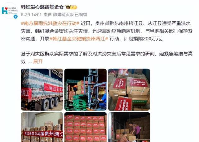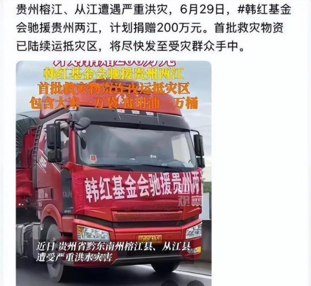 6 月 24 日本,贵州遭遇罕见的洪水。灾难一出来,军队官兵就赶到现场救援,爱心人士不断送来捐款和物资。韩红亲自带着她的团队前往前方支援。
