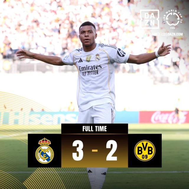 在新泽西州大都会人寿体育场,皇家马德里与多特蒙德进行了比赛。上半场,贡萨洛连场破门破门。 5 场 4 球 1 助,弗兰 - 下一个城市加西亚。易边再战,琼阿梅尼远射中框,拜尔补时扳回一座城市,姆巴佩侧勾破门,怀森读秒送红点,吉拉西点击建功,库尔图瓦神扑在最后一刻解决萨比策的绝平打门。最后皇马 3 比 2 多特蒙德晋级四强,将与巴黎进行比赛。