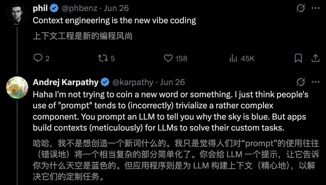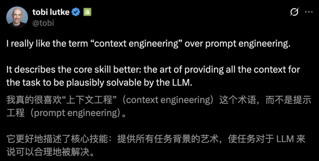 Shopify CEO Tobias Lütke表示更喜欢「上下文工程」,因为它准确描述了一个核心技能——通过为任务提供完整背景信息,让大模型合理解决问题的艺术。