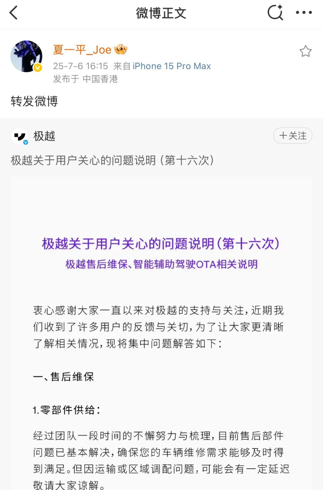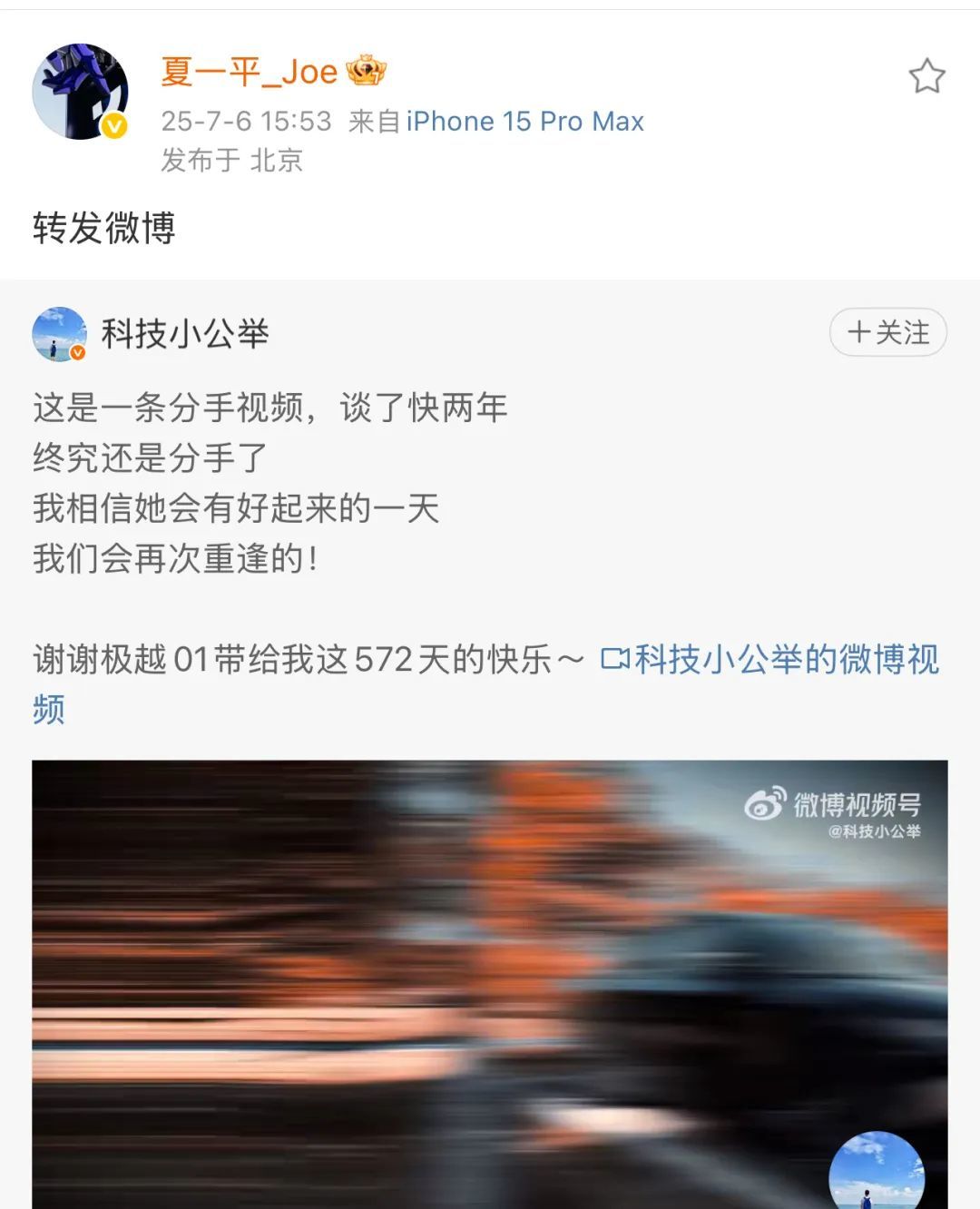 今日下午,许久未曾发声的极越CEO夏一平突然更新了两条微博。