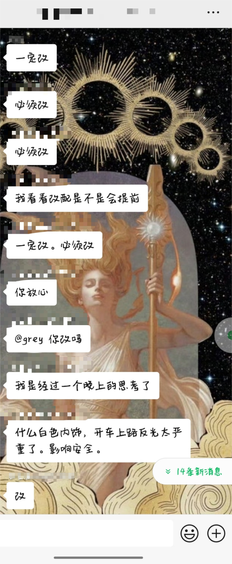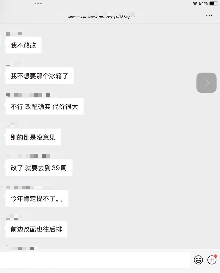 小米官方称,改配活动结束后,会根据订单总量、改配数量等因素展示新的预计交付时间。一些改完配置的车主发现,交付时间推迟到了60周左右,他们心灰意冷,开始在群里聊家乡。