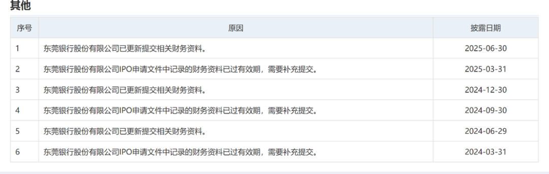 根据深交所官网,2023年起,东莞银行IPO进程多次因财务资料过期中止,期间递交6版招股说明书。