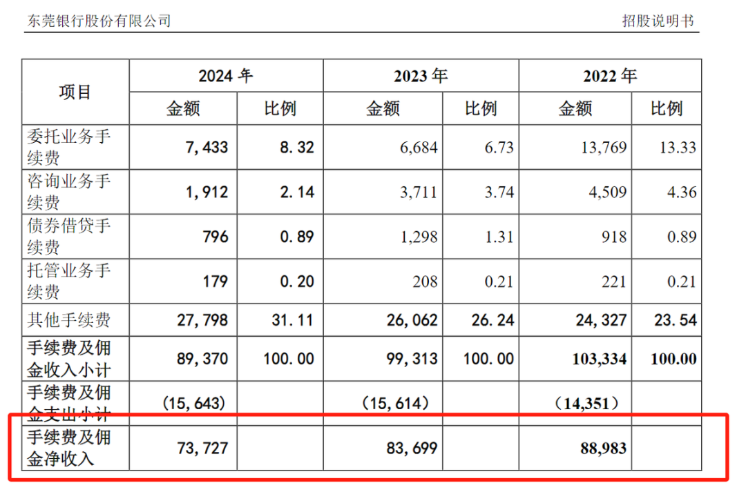 不过,东莞银行和多数商业银行一样,非息收入依赖投资收益,而非中间收入。招股书显示,手续费及佣金净收入近年下降,2024年末为7.37亿元,较2023年下降近1亿元,降幅11.95%。