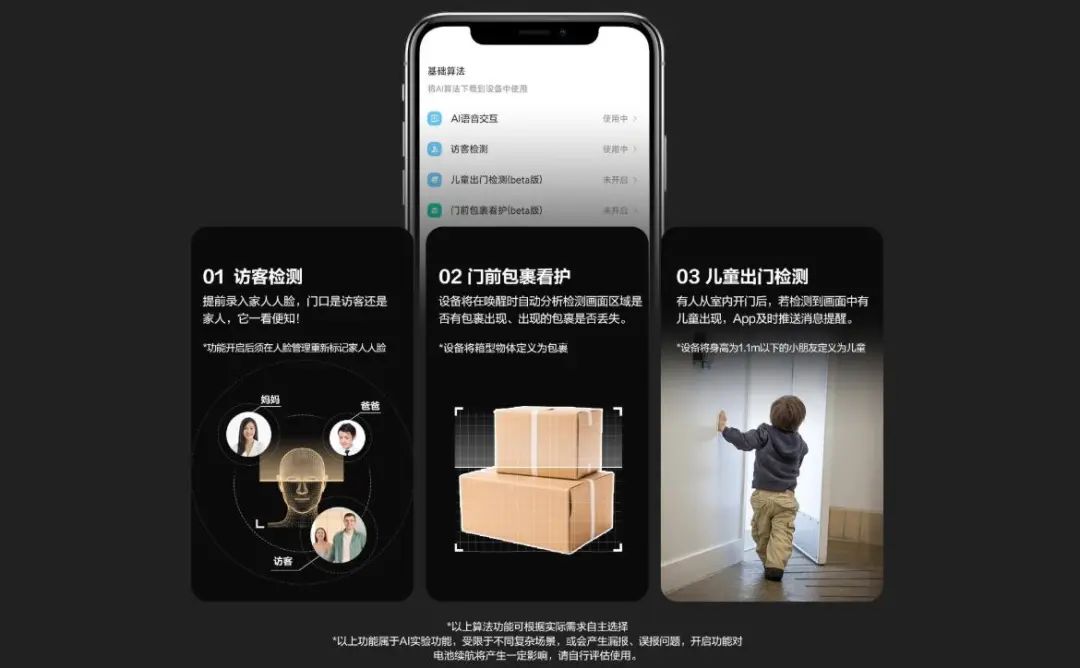 在AI算法商店的加持下,萤石人脸视频锁还升级了智能看护能力。比如可自动检测门口包裹情况并通过APP提醒;开门时有儿童出现,系统会发消息提醒;还可联动萤石室内摄像机和睡眠检测雷达,实时检测长辈居家安全。