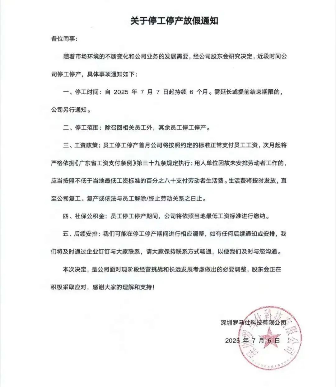 7月6日凌晨一点左右,罗马仕员工收到的公司正式发布的停工停产通知文件。 受访者供图