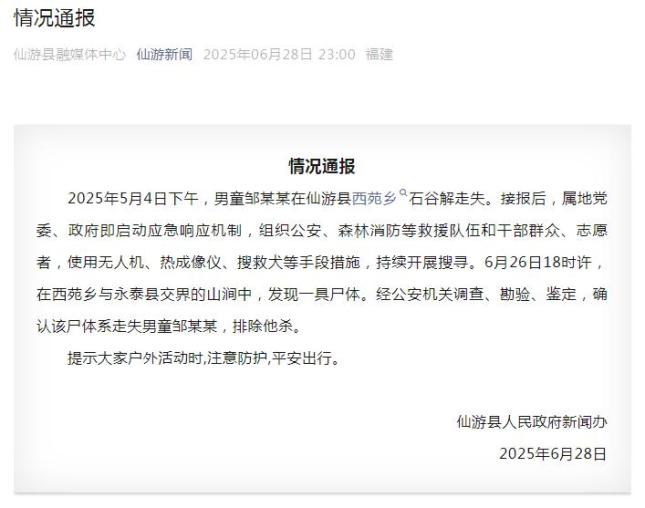 男童爬山失联,50多天遗体被找到。5月4日,一名8岁男童随父母到福建省莆田市仙游县石谷解登山,下山时与父母失联。各方持续搜寻,6月28日晚,仙游县人民政府新闻办通报,确认男童遇难。石谷解海拔1803.3米,是闽中第一高峰,且为未开发的野山。