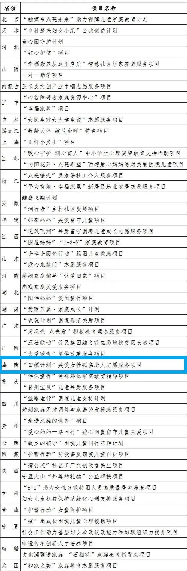 为推动女性社会组织中妇联组织建设,引导女性社会组织更好服务妇女儿童和家庭,全国妇联社联中心面向全国征集展示女性社会组织特色项目及案例。经组织推荐、审核、评审和公示,选出50个服务妇女儿童和家庭特色项目、10个全覆盖特色案例。其中,海口市妇联推荐的海口市云开见日义工社《“田螺计划”关爱女性孤寡老人志愿服务项目》入选全国女性社会组织服务妇女儿童和家庭特色项目,是海南省唯一入选项目。