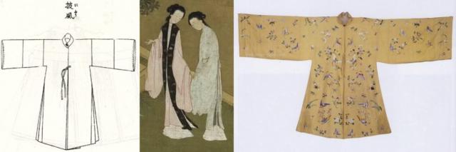 竖领对襟大袖披风是晚明流行的款式,其特点是对襟、直袖或广袖,领扣用扣相连,衣襟用系带相连,是一种外套样式,也有人把它叫做戏服说法里的“闺门帔”。