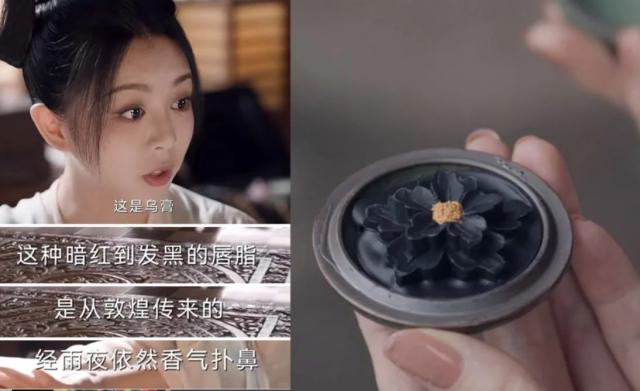 在“口黑”的时尚装扮元素方面,有人觉得这是现代风格,其实在古代也有类似“口黑”的唇妆。《唐诡 2》里喜君、马夫人提到的「乌膏」,在唐代确实存在,它也是“时世妆”(流行妆面)的一种特色口脂。