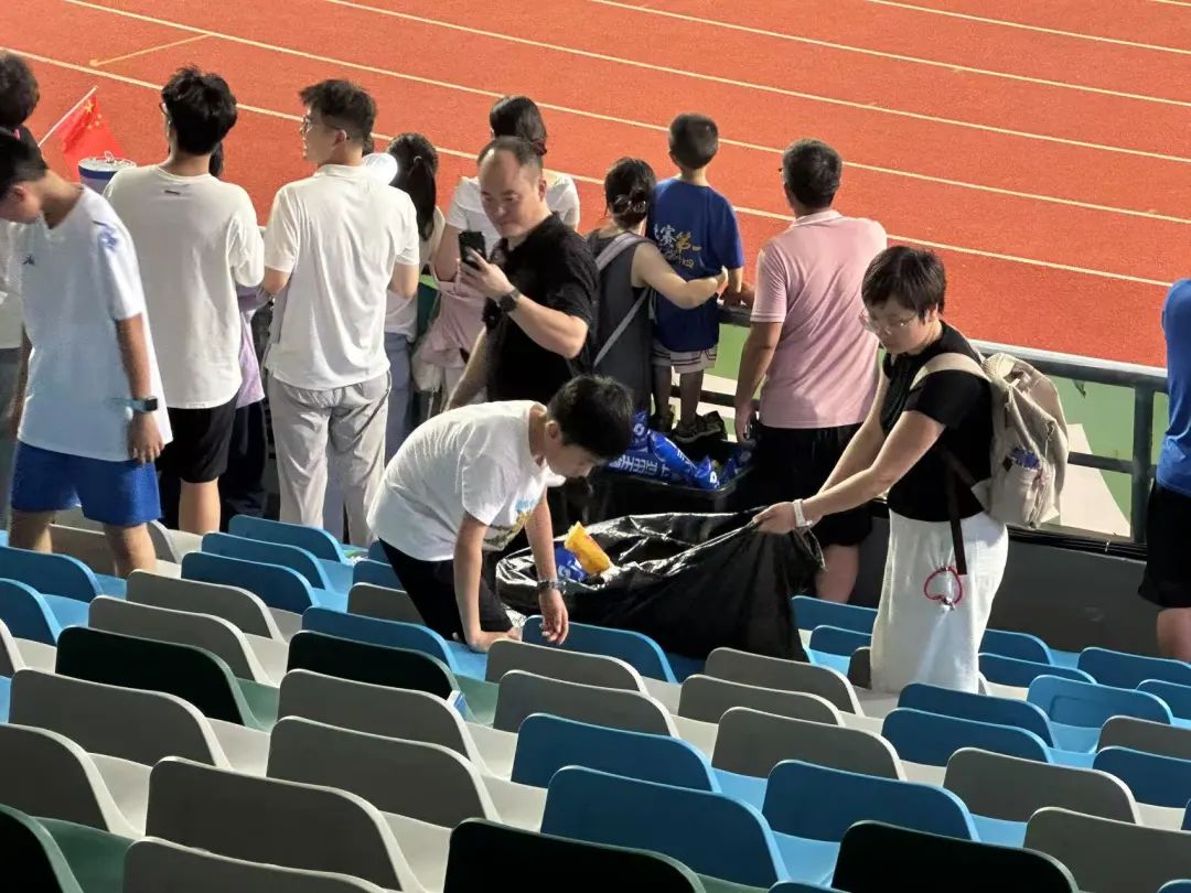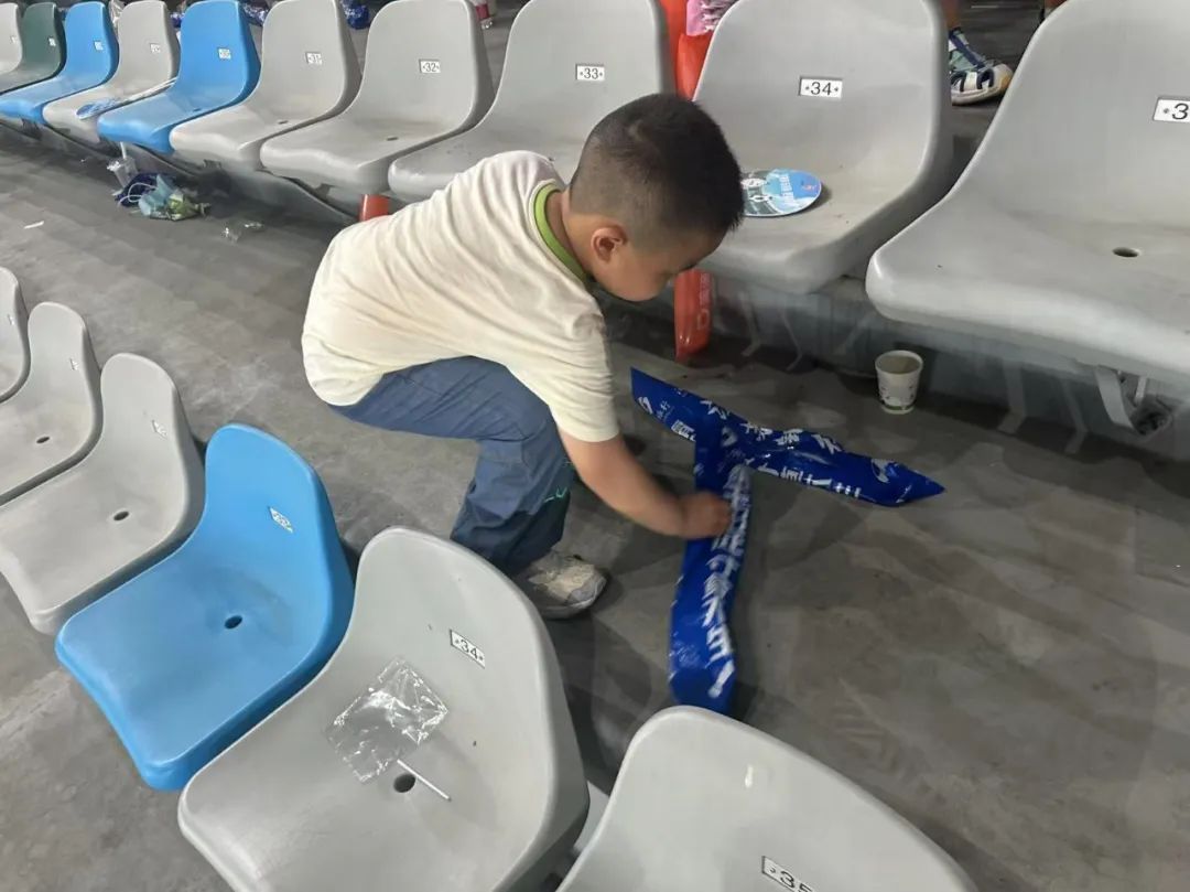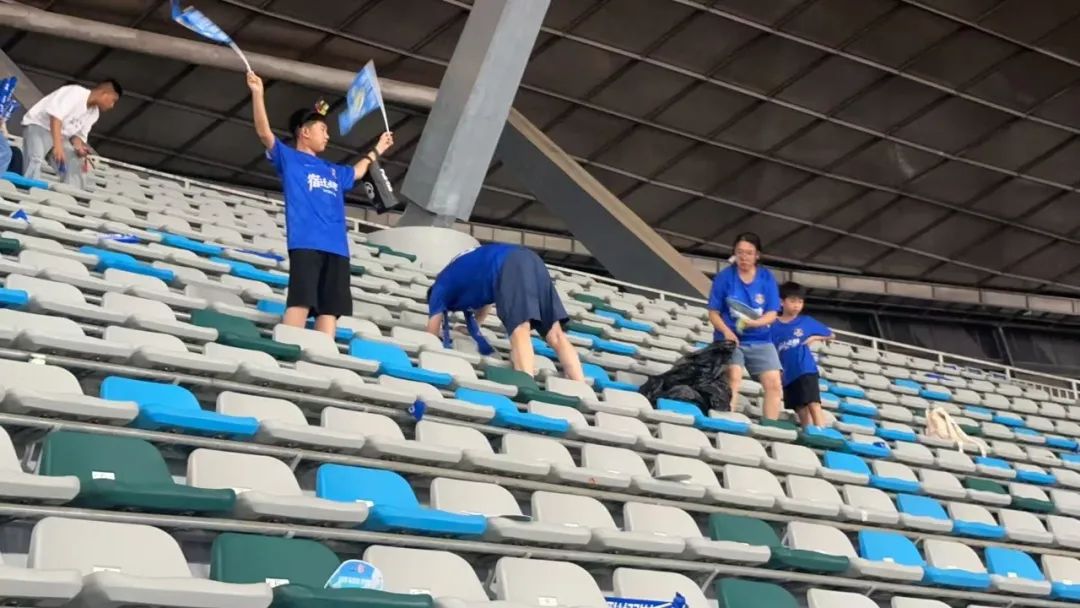 散场后,一整片蓝色海洋般的球迷不分主客,默默俯身,将看台上的杂物一一拾起,做到了“人走场净”。