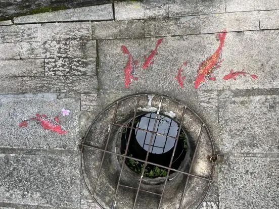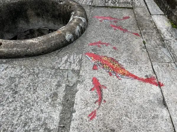老街坊李伯好奇地走到正在石湾直街水井旁作画的陈老师身旁,凑近看了看,称赞道:“老师,您真有耐心,画得非常好看!”正挥舞着画笔的陈劲柏老师抬起头,画笔上蘸着红色的颜料,笑着指向地上画的鱼,说道:“我们在‘埋彩蛋’呢!这水井旁正好画几条锦鲤,能让游客在老街有个小惊喜。”