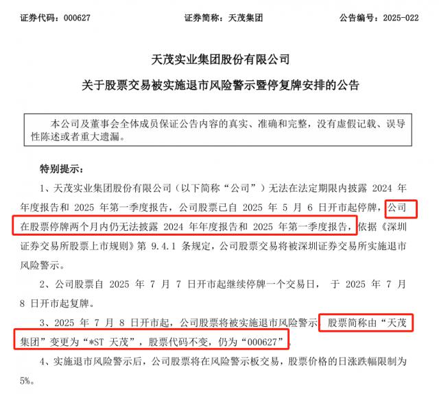 7月6日晚间,天茂集团发布公告称公司将被*ST。年报季早已过去,公司为何会触及*ST呢?原来是公司2024年年报和2025年一季报尚未完成披露,而证监会早在5月7日就已对该公司进行立案调查。