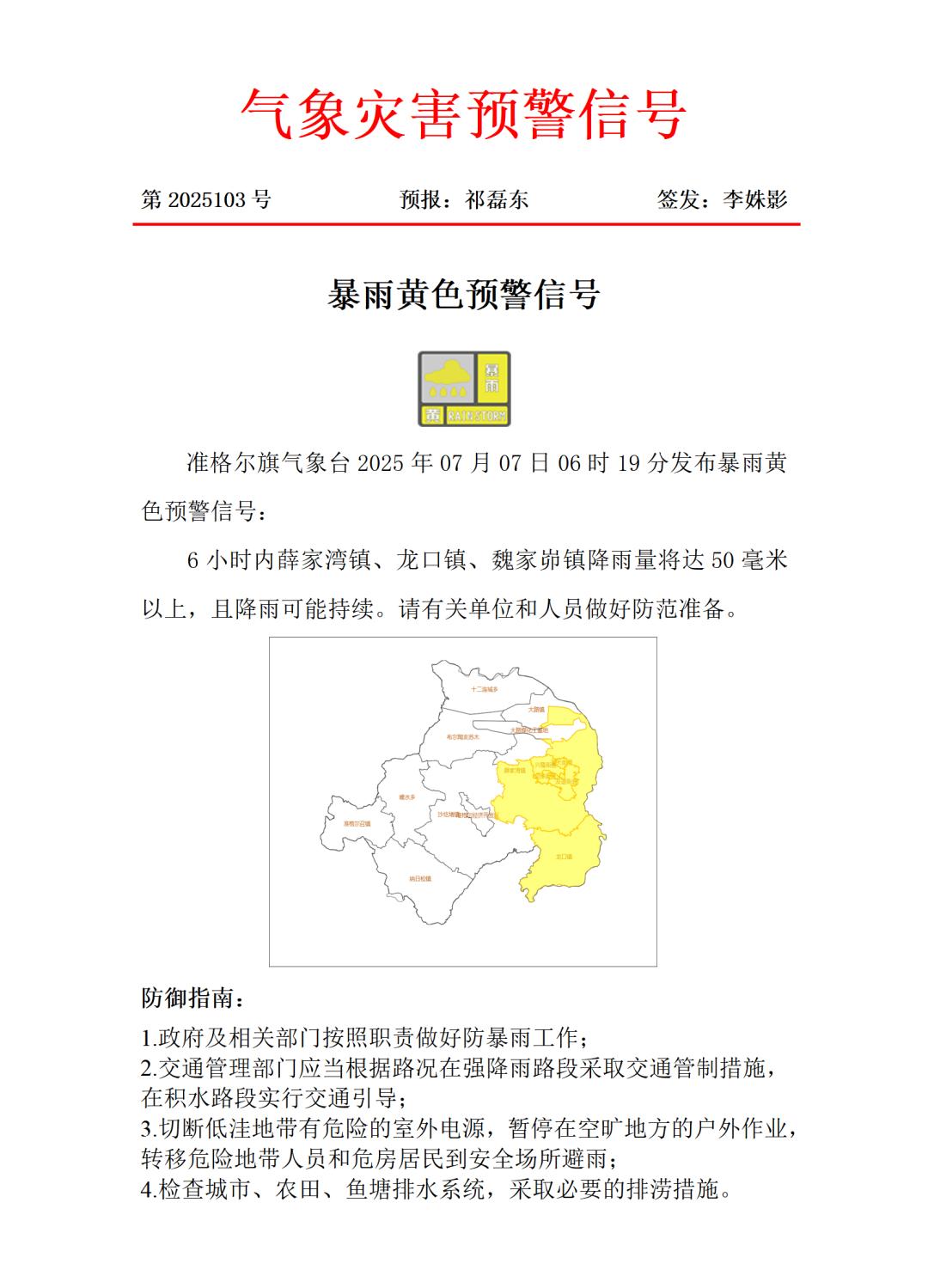 2025年07月07日06时19分,准格尔旗气象台发布暴雨黄色预警信号,6小时内薛家湾镇、龙口镇、魏家峁镇降雨量将达50毫米以上,且降雨可能持续。请有关单位和人员做好防范准备。