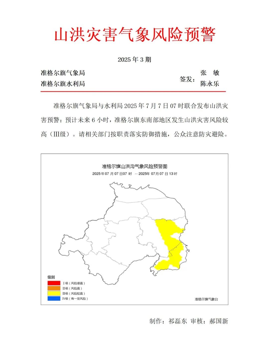 2025年7月7日07时,准格尔旗气象局与水利局联合发布山洪灾害预警,预计未来6小时,准格尔旗东南部地区发生山洪灾害风险较高(III级)。请相关部门按职责落实防御措施,公众注意防灾避险。