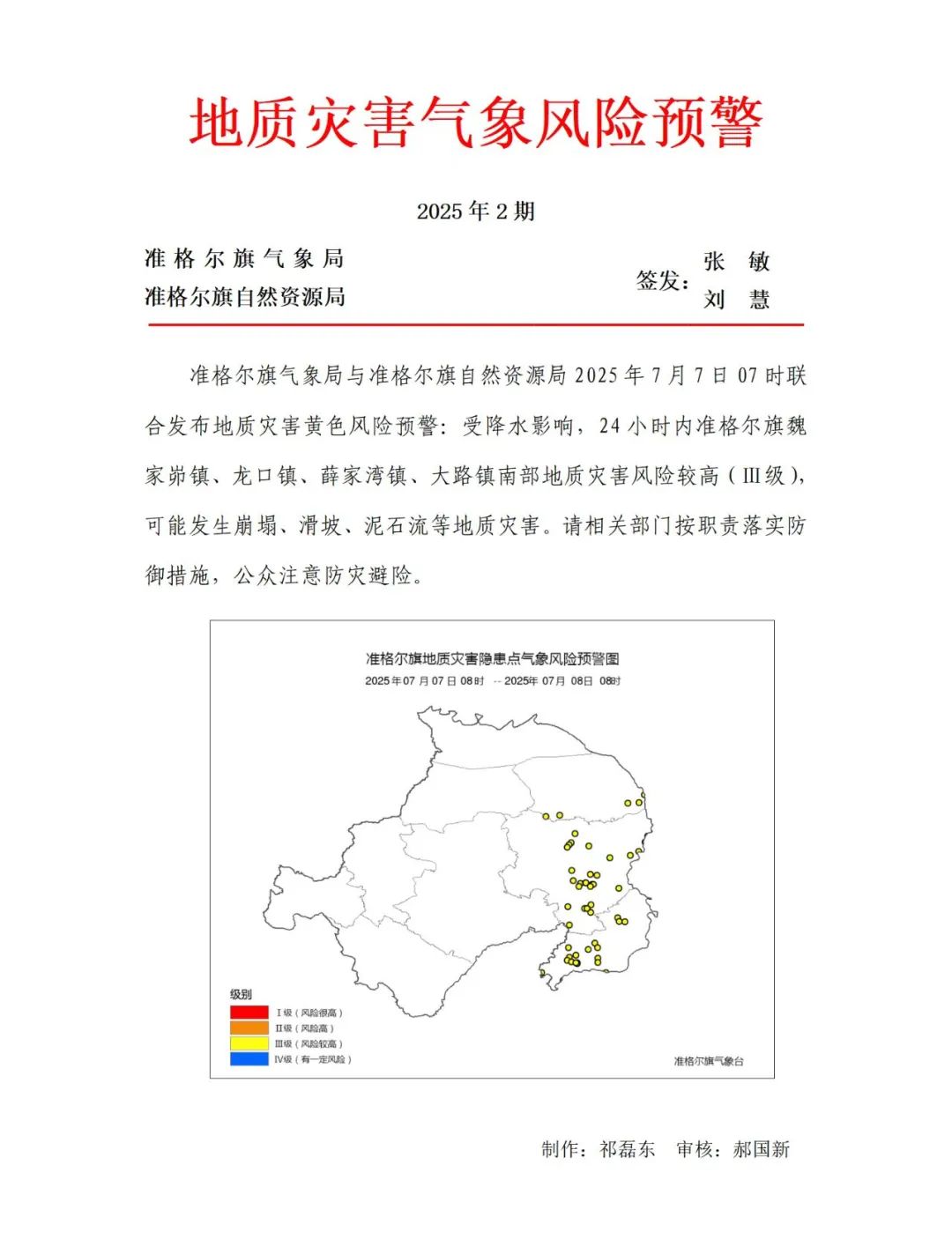 2025年7月7日07时,准格尔旗气象局与准格尔旗自然资源局联合发布地质灾害黄色风险预警,受降水影响,24小时内准格尔旗魏家峁镇、龙口镇、薛家湾镇、大路镇南部地质灾害风险较高(Ⅲ级),可能发生崩塌、滑坡、泥石流等地质灾害。请相关部门按职责落实防御措施,公众注意防灾避险。
