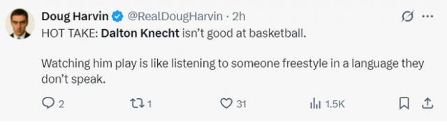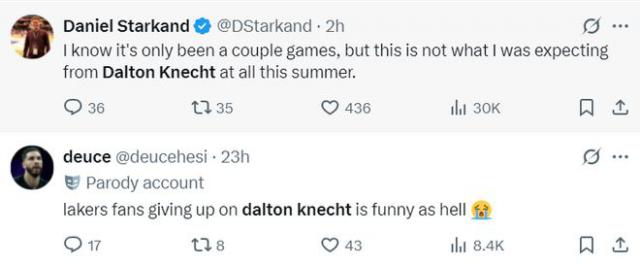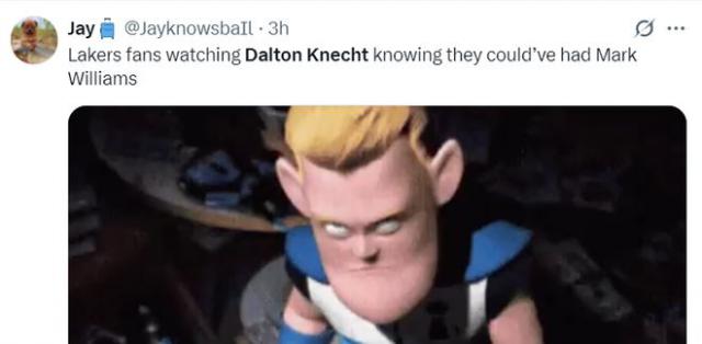 美球迷表示:湖人队的球迷们看着道尔顿 - 克内克特的比赛,心里想着要是当初能换来马克 - 威廉姆斯该多好啊。