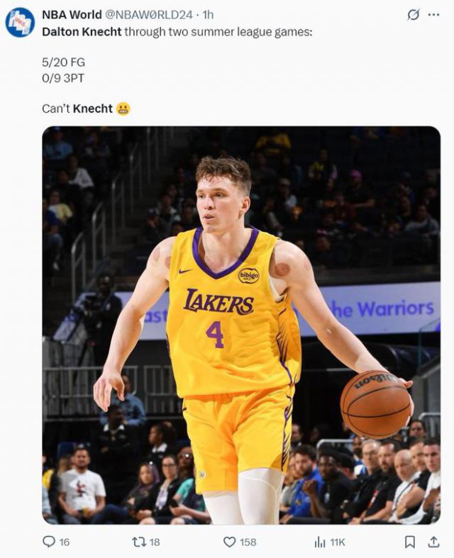 两场夏联合计,克内克特20投9中,三分9投0中。这很难让人相信这是田纳西大学队史最顶级投手的表现。要知道,克内克特今年已经24岁,而布朗尼才20岁。湖人当初正是看重克内克特的即战力才选择了他,可他这样的表现引来了多方批判。
