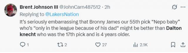 湖人球迷吐槽:这实在是让人尴尬至极,我们55顺位选中的布朗尼竟然比17顺位选中的克内克特还要出色。你们都说布朗尼进入联盟是依靠他父亲的关系,可克内克特比布朗尼还要年长四岁。