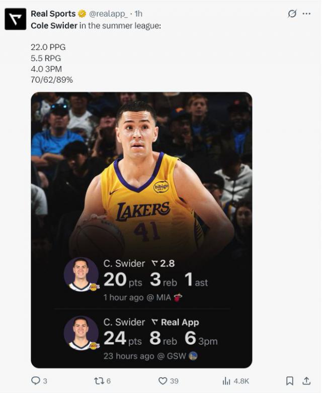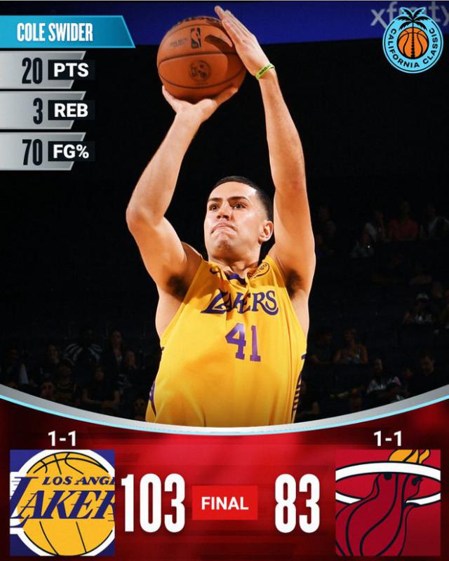 26岁的斯威德依旧表现出色,继上一场砍下24分8篮板6个三分后,这场又拿下20分并命中2个三分。两场比赛场均22分5.5篮板4个三分,命中率达70%,三分命中率为62%。相比之下,湖人去年17号秀道尔顿 - 克内克特的表现就差强人意了。