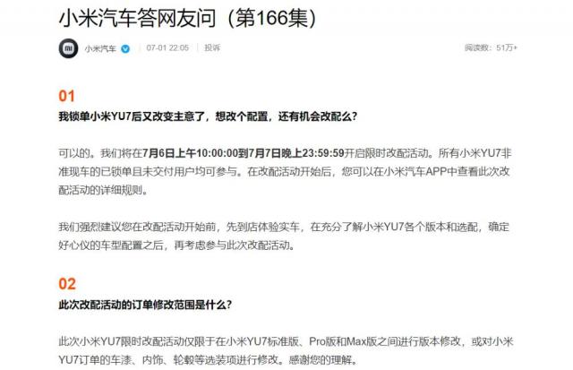 需要留意的是,此次小米YU7限时改配活动仅允许在小米YU7标准版、Pro版和Max版之间进行版本更改,或者对小米YU7订单的车漆、内饰、轮毂等选装项进行修改。