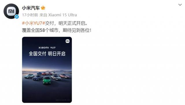 今日,小米YU7正式开启全国交付,其交付范围覆盖全国58个城市。
