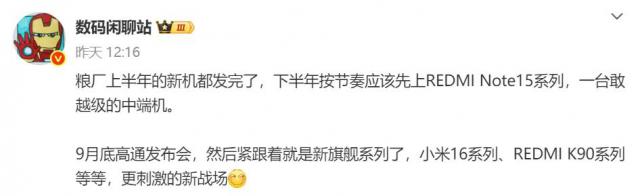 9月底高通发布会之后,紧接着就是新旗舰系列,小米16系列、REDMI K90系列等都将登场。