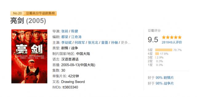 作为中国抗战题材的标杆之作,《亮剑》创造了多项难以超越的纪录:累计重播超过3000次;豆瓣评分高达9.5,在超过28万人评价的基础上,依然稳居华语电视剧Top10;剧中李云龙的那句“狭路相逢勇者胜,明知不敌,也要敢于亮剑!”成为令人印象深刻的经典台词,“亮剑精神”更成为一种文化符号,影响了几代人。
