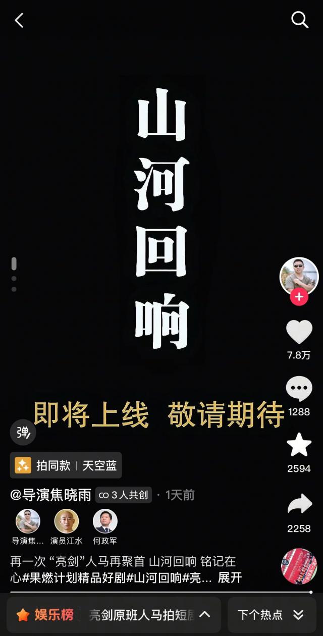 据悉,此次拍摄的短剧《山河回响》,是以“跨时空电台对话”为核心设定的红色题材作品,试图通过两代青年共护山河的故事,延续《亮剑》的热血与家国情怀。此外,短剧《山河回响》将于8月份在红果短剧、新华社客户端上线。