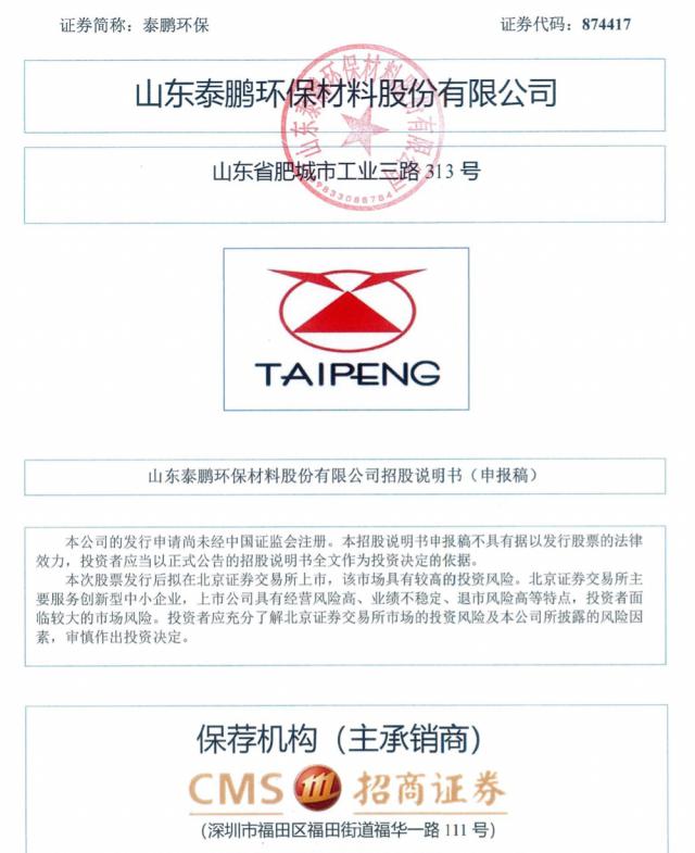 近日,山东泰鹏环保材料股份有限公司(以下简称“泰鹏环保”)北交所IPO申请获受理,保荐机构为招商证券股份有限公司,保荐代表人为崔永锋、郑立伟,会计师事务所为容诚会计师事务所(特殊普通合伙)。