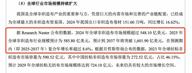 据Research Nester公布的数据,2024年全球非织造布市场规模超过548.10亿美元,2025年全球非织造布行业规模预计为585.80亿美元,预计到2037年将突破1,601.90亿美元,在预测期内 (即2025 - 2037年) 复合年增长率超过8.6%。