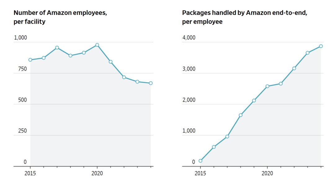 员工与包裹趋势:左图显示每个仓库的员工数量逐年下滑,右图表明每人处理的包裹数量年年攀升。
