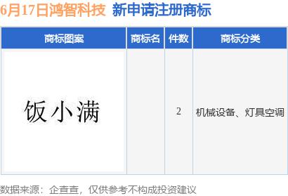 据证券之星消息,天眼查APP数据显示,近日广东鸿智智能科技股份有限公司新提交了2件商标注册申请。商标申请详情如下:
