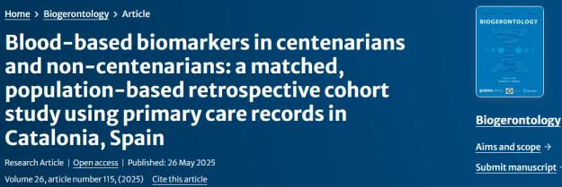 ⑧Moreno, M.A., Vidal - Alaball, J., Saez, M. et al. Blood - based biomarkers in centenarians and non - centenarians: a matched, population - based retrospective cohort study using primary care records in Catalonia, Spain. Biogerontology 26, 115 (2025).