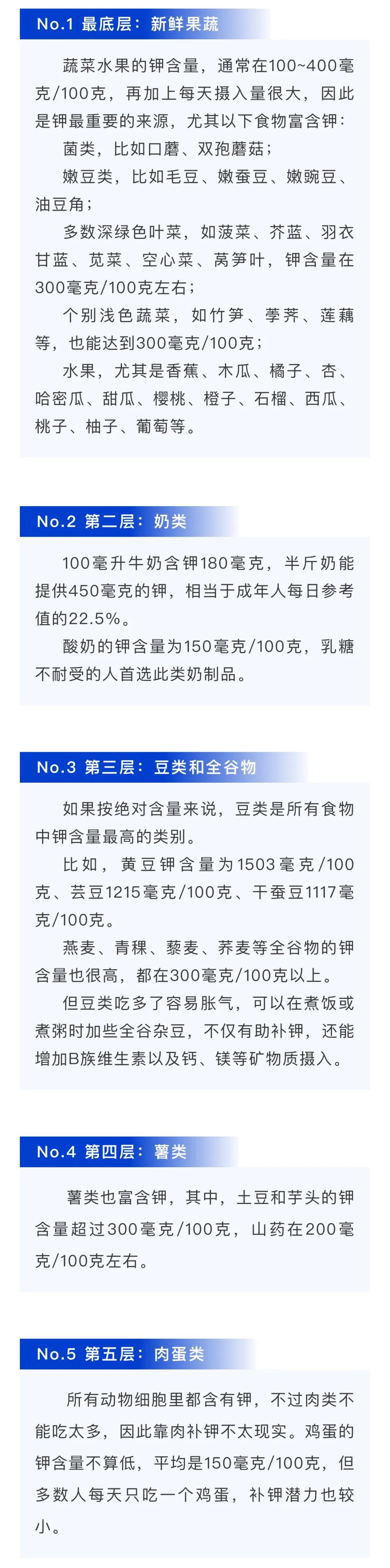 身体中的钾主要来源于食物,膳食中90%的钾通过肠道吸收入血,并通过汗液、尿液、消化道等排泄,使钾保持在动态平衡中。中国疾病预防控制中心营养与健康所研究员张倩,为大家整理出一座膳食补钾“金字塔”。