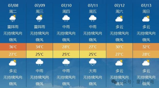 受台风“丹娜丝”外围环流影响,今明两天,厦门依旧会有雨水相伴,气温仍然偏高,闷热感持续。今日最高气温将升至36℃左右,最低气温也在27℃左右。天气整体以多云到阴天为主,午后可能会有雷阵雨,局部地区有大到暴雨。
