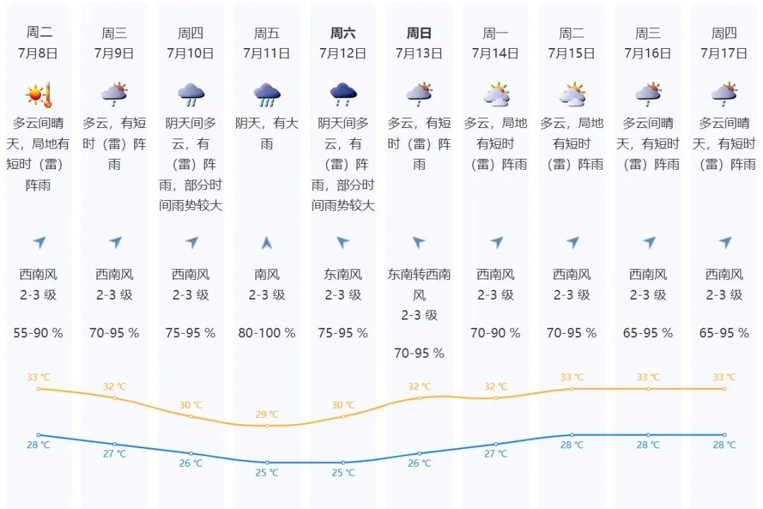 7月8日,天气多云间晴天,局地有短时(雷)阵雨;气温28℃ - 33℃;西南风2 - 3级;相对湿度55 - 90%。